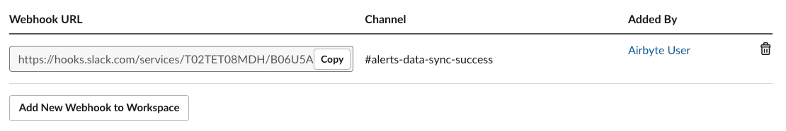 Allowto give it permissions to access the channel. You should see the bot show up in the selected channel now. You will see an active webhook right above theAdd New Webhook to Workspacebutton.